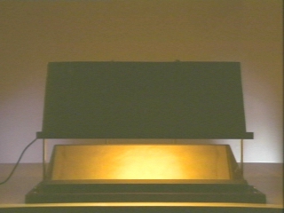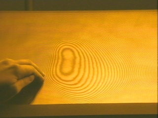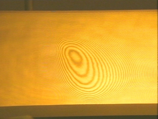| Two stacked glass plates viewed in sodium light show an interference pattern. (Disc 23-14, 49 sec.) |