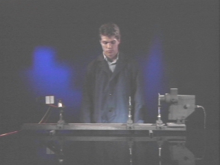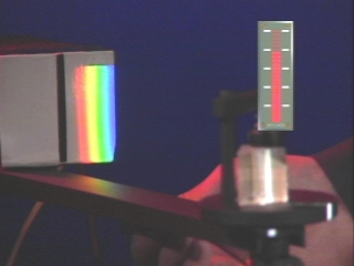 | Light from a carbon arc lamp is split by a prism, and the energy at different wavelengths is displayed on a galvanometer connected to a thermopile. (Disc 23-22, 1 min. 6 sec.) |