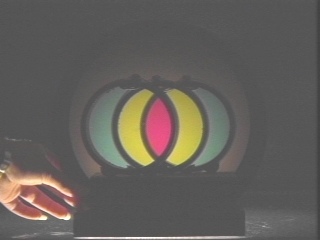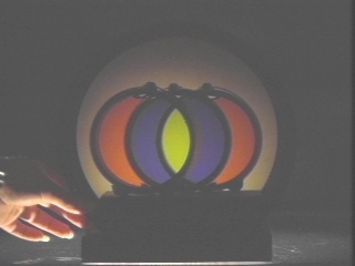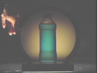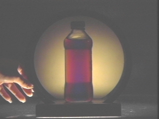 | Two different containers of corn syrup are placed between polarizing filters to demonstrate optical activity. (Disc 24-11, 1 min. 6 sec.) |