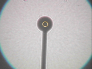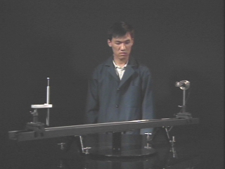 | A point source of white light diffracts around a small sphere to create a bright spot in the center of the sphere's shadow. (Disc 23-5, 36 sec.) |