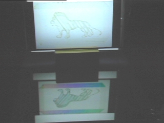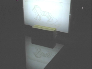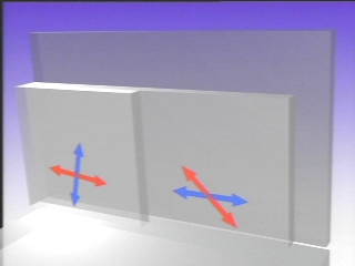 | When a lion made of cellophane tape is illuminated by polarized light, certain wavelengths are preferentially reflected from a glass plate. Computer animated graphics explain the effect. (Disc 24-10, 1 min. 14 sec.) |