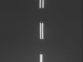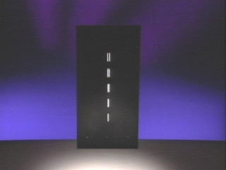 | Five sets of double slits with different slit separation are initially viewed from a distance. As the camera moves in, the narrower double slits are resolved. (Disc 23-9, 1 min. 23 sec.) |