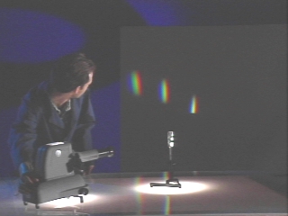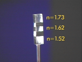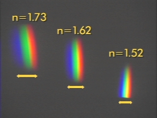 | Three different prisms are used to show the effect of the refractive index on dispersion and the angle of refraction. (Disc 22-9, 25 sec.) |