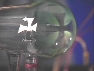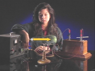 | An electron discharge tube with a cross inside demonstrates that electrons travel in a straight line. (Disc 25-4, 35 sec.) |