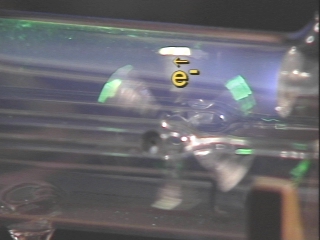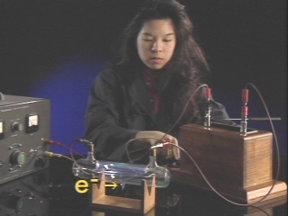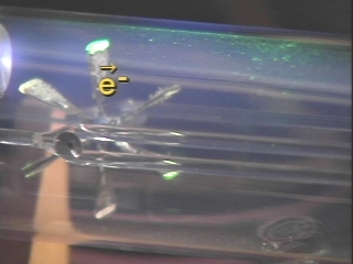 | An electron beam in an evacuated tube turns a paddlewheel, demonstrating that electrons have momentum. (Disc 17-17, 42 sec.) |